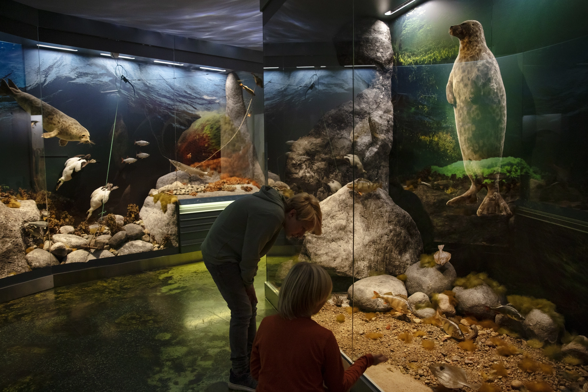 The Baltic Sea has only around 20 species of marine fish, and you can see a school of one of these in front of you. These are Baltic herring - Finland’s most important economic fish. People living along the Atlantic coast are probably surprised about the important role the herring plays in our economy. It is significantly smaller in size compared to the Atlantic herring.